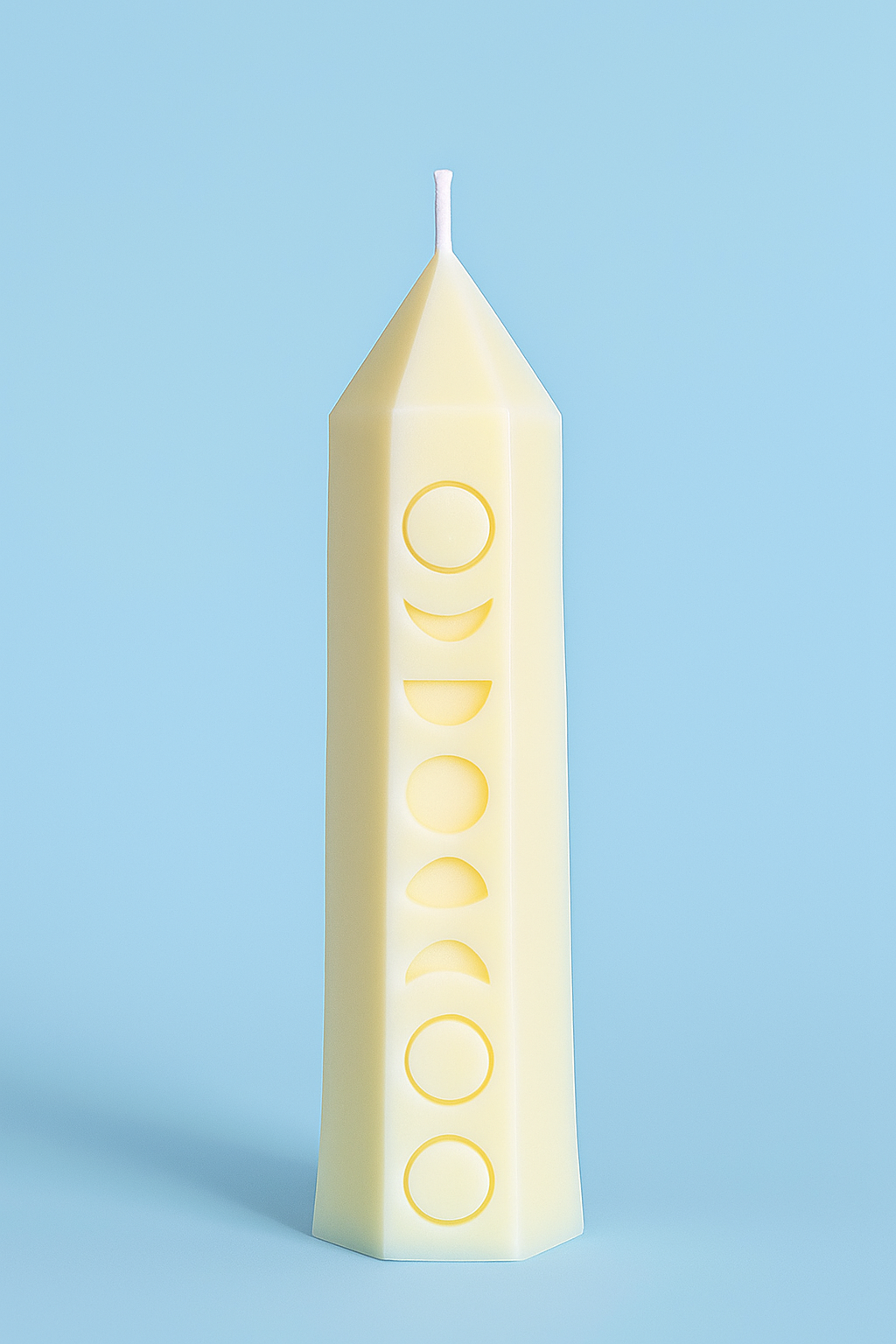 Aporta calma, luz y un toque de magia a tu espacio con nuestra vela artesanal de fases lunares. Su diseño elegante en forma de obelisco, con relieves que representan el ciclo lunar, la convierte en una pieza decorativa única.