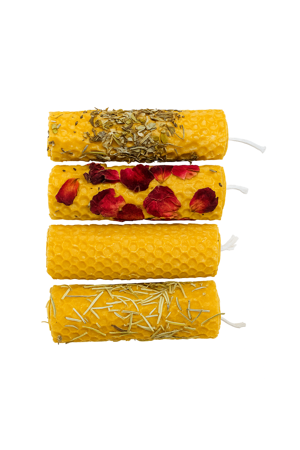 Estas velitas están hechas a mano con cera pura de abeja, conservando su color dorado natural y su delicado aroma dulce. Cada una está cuidadosamente decorada y aromatizada con hierbas seleccionadas y pétalos naturales, creando una experiencia única y energética. Vienen con una tarjeta explicativa del uso de estas velitas y los días ideales para encenderlas.