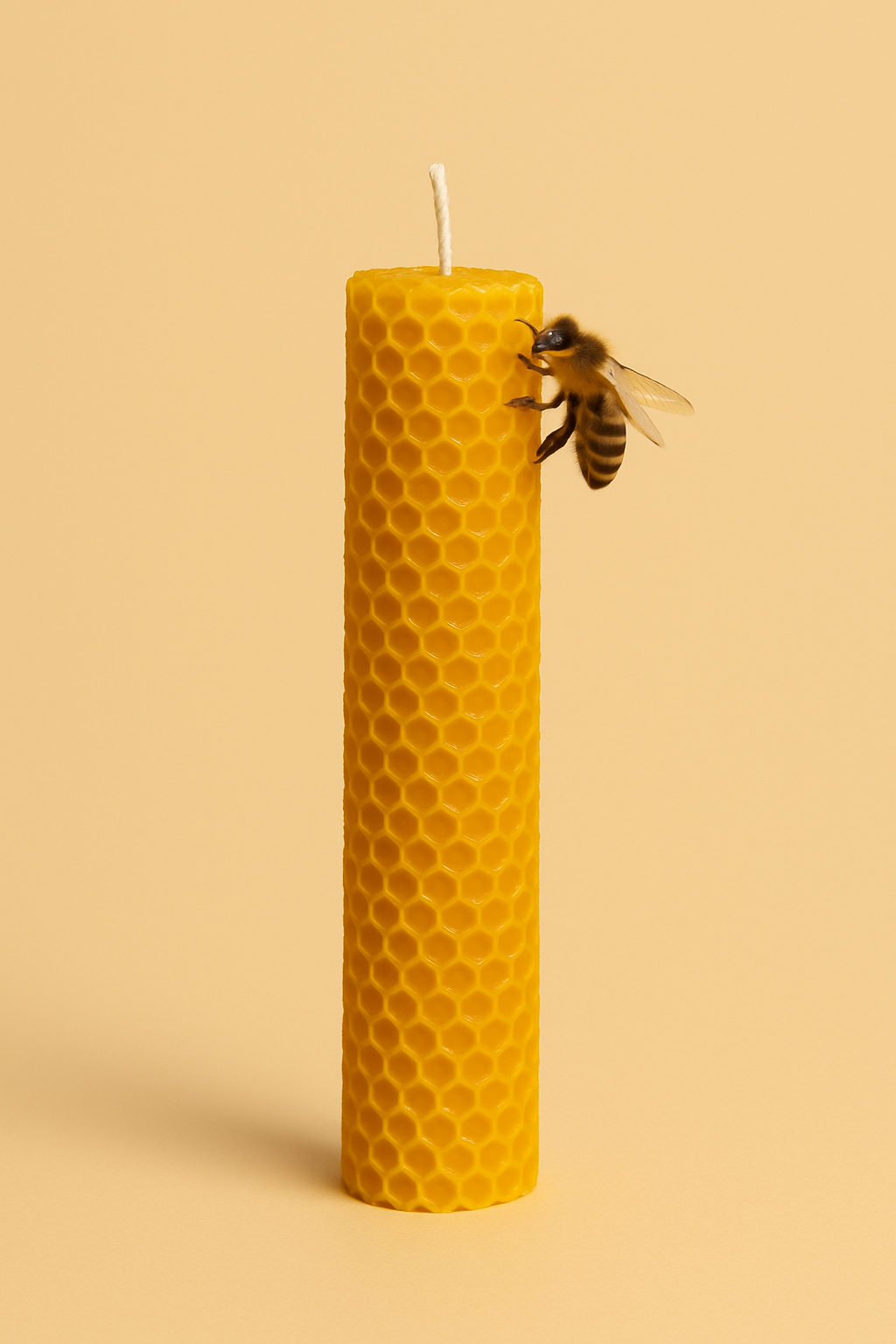 Elaborada artesanalmente con auténtica cera de abeja, esta vela presenta un diseño cilíndrico con patrón de panal que resalta su pureza y origen natural. Su color miel transmite calidez y su aroma suave, propio de la cera de abeja, crea una atmósfera armónica y acogedora.